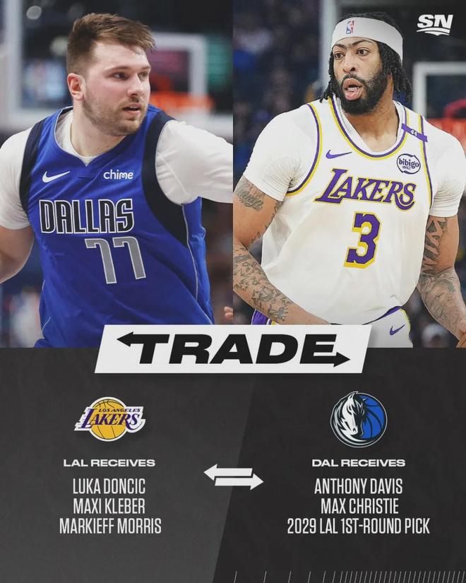 上赛季的季中交易截止日之前,小牛主动联系湖人,最终达成了3换3的惊天大交易:湖人得到东契奇、大莫里斯和克莱伯,小牛得到浓眉、克里斯蒂和2029年的首轮签。